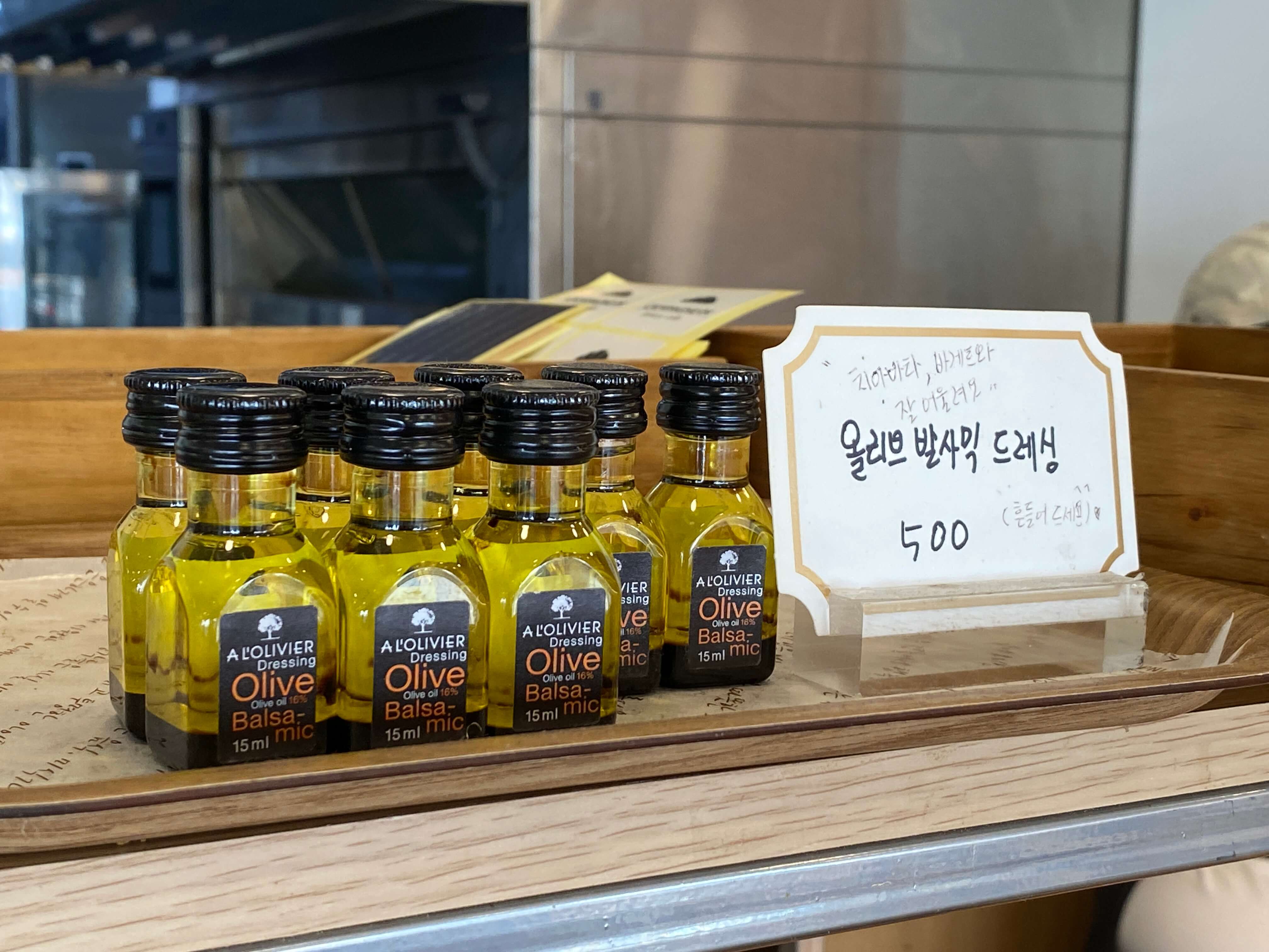 빵이랑 같이 먹을 귀여운 올리브 발사믹 드레싱도 2개 구매했습니다. 빵을 구매하면 따로 비닐에다가 넣어주고요 썰어갈지도 물어보시더라고요. 저희는 먹기 좋게 미리 잘라달라고 부탁드렸습니다.