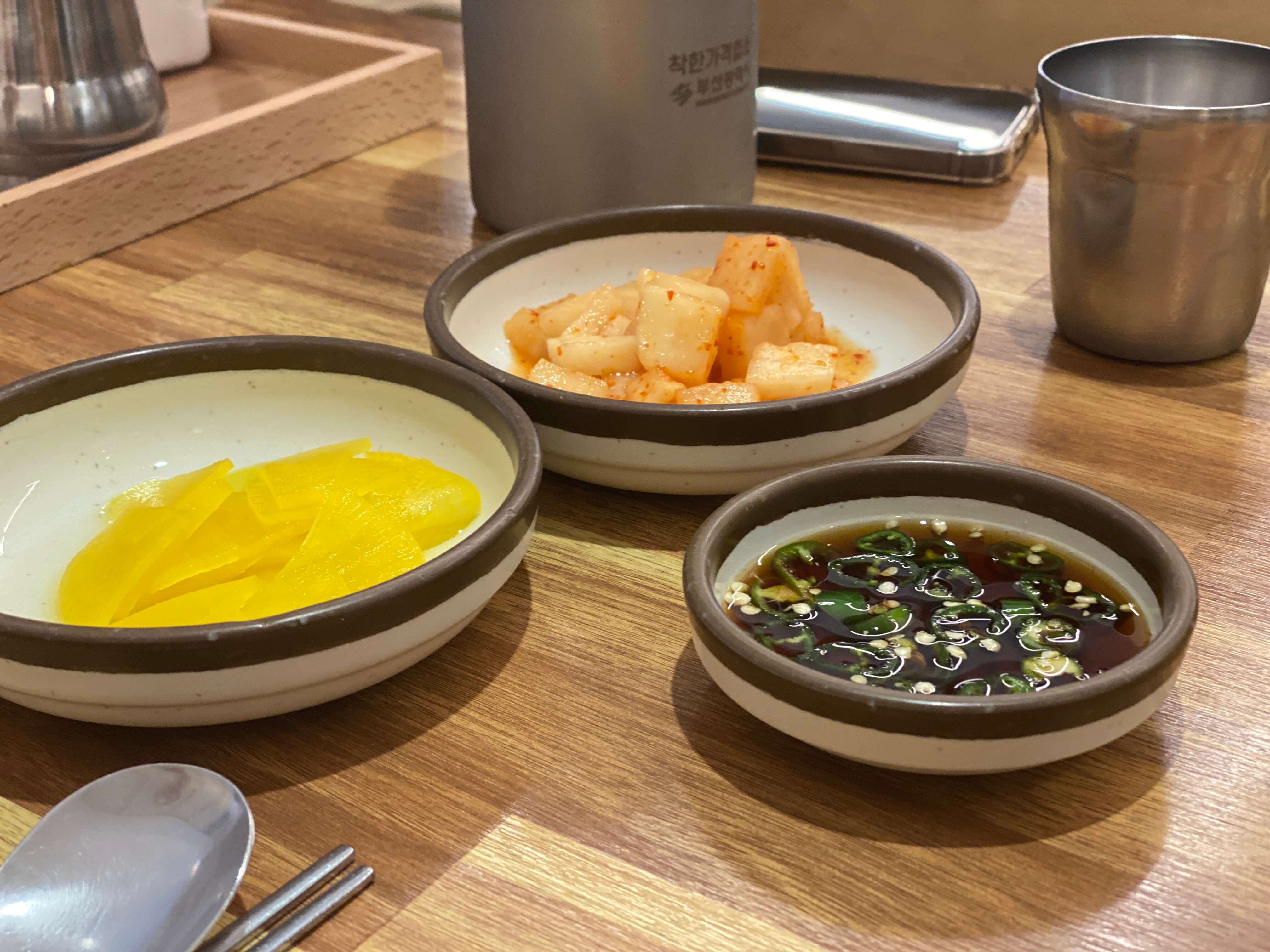 기본으로 주는 단무지와 깍두기에요. 칼국수는 단무지랑도 잘 어울리고 깍두기와도 잘 어울렸어요.