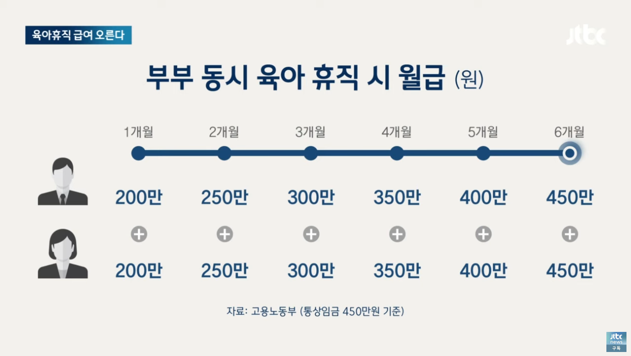 예를들어 통상임금이 월 450만원인 부부가 동시에 육아휴직을 한다고 가정할 경우 첫 달인 1개월에는 200만원, 차츰 늘어나 6개월차에는 각 450만원씩 총 900만원을 지원받게 됩니다. 부부 합산 최대 3900만원을 받을 수 있게 된다고 합니다.