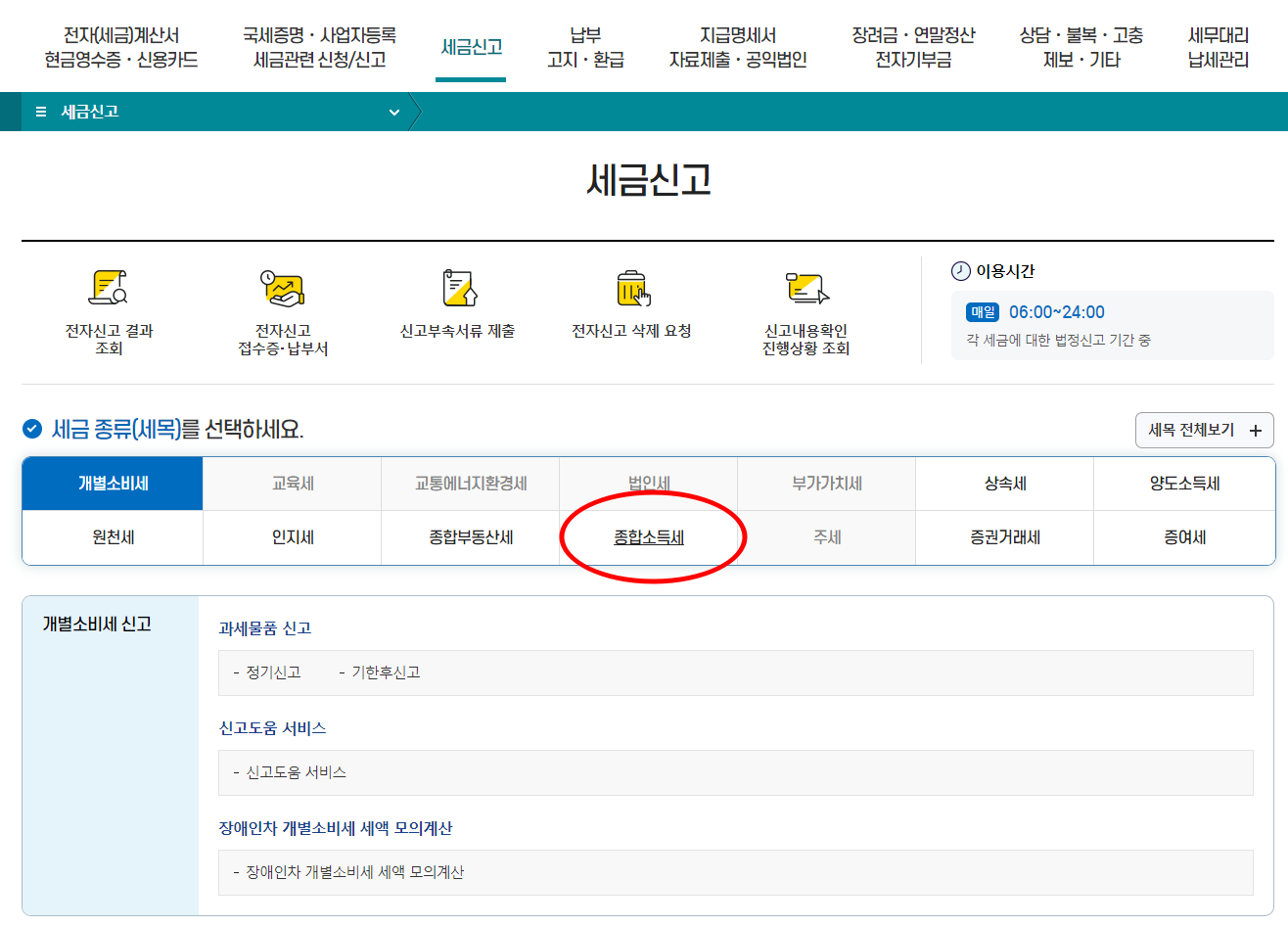 그리고 세금신고 란에서 '종합소득세' 세목을 선택합니다.