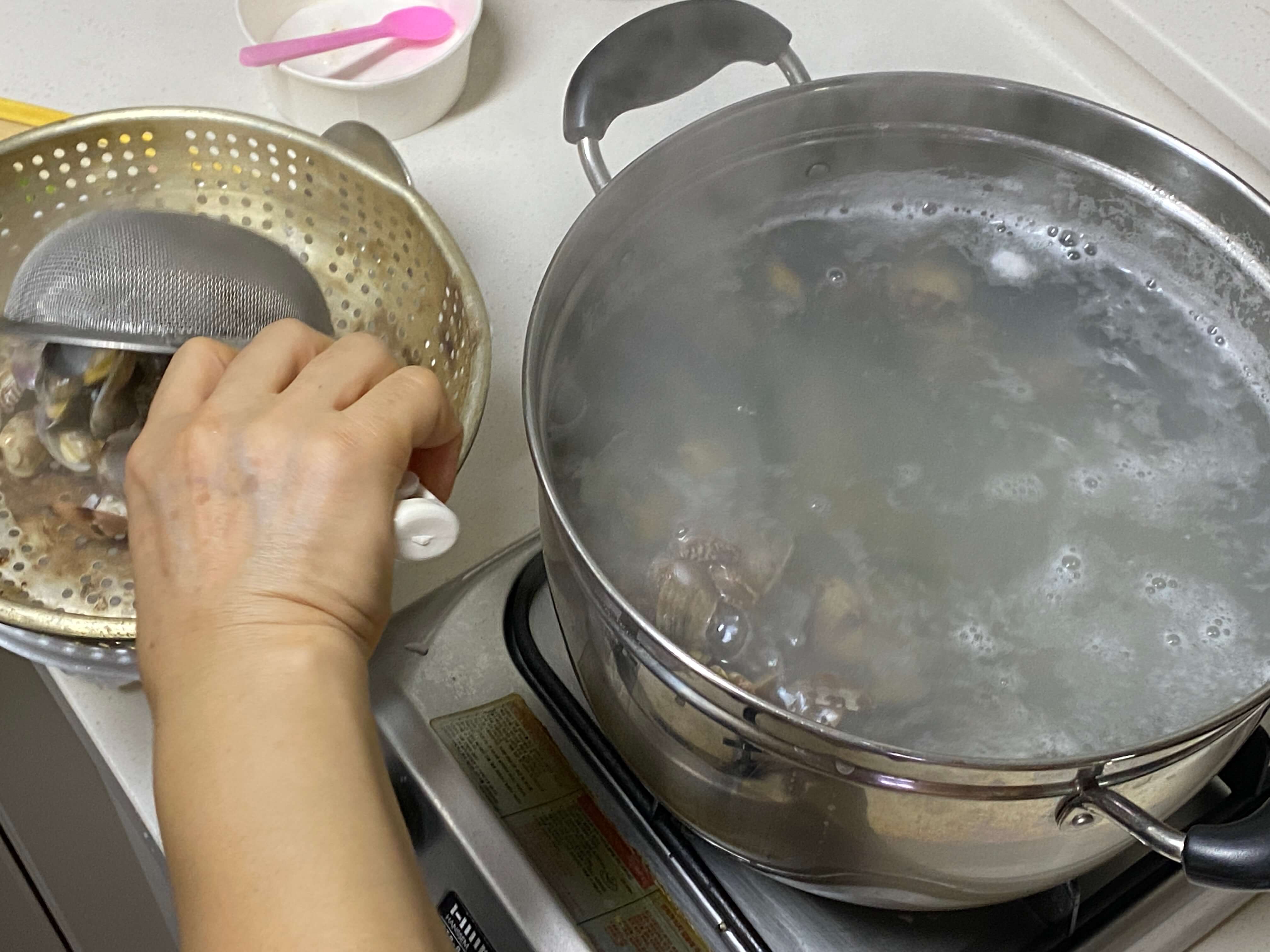 조개를 건져내고 남은 국물은 다른 솥에 한 번 옮겨서