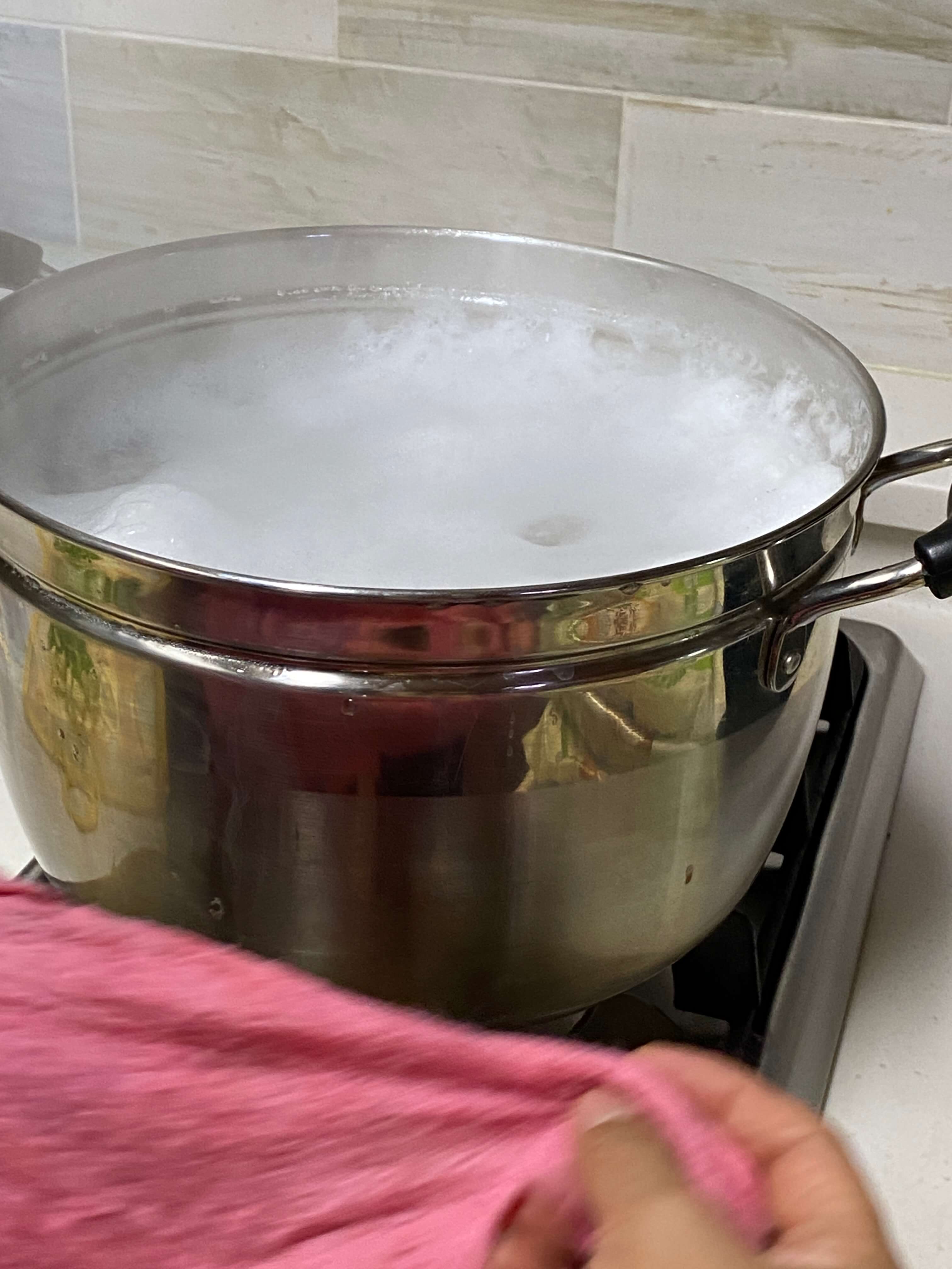 뚜껑을 덮고 끓이다보면 거품이 생겨서