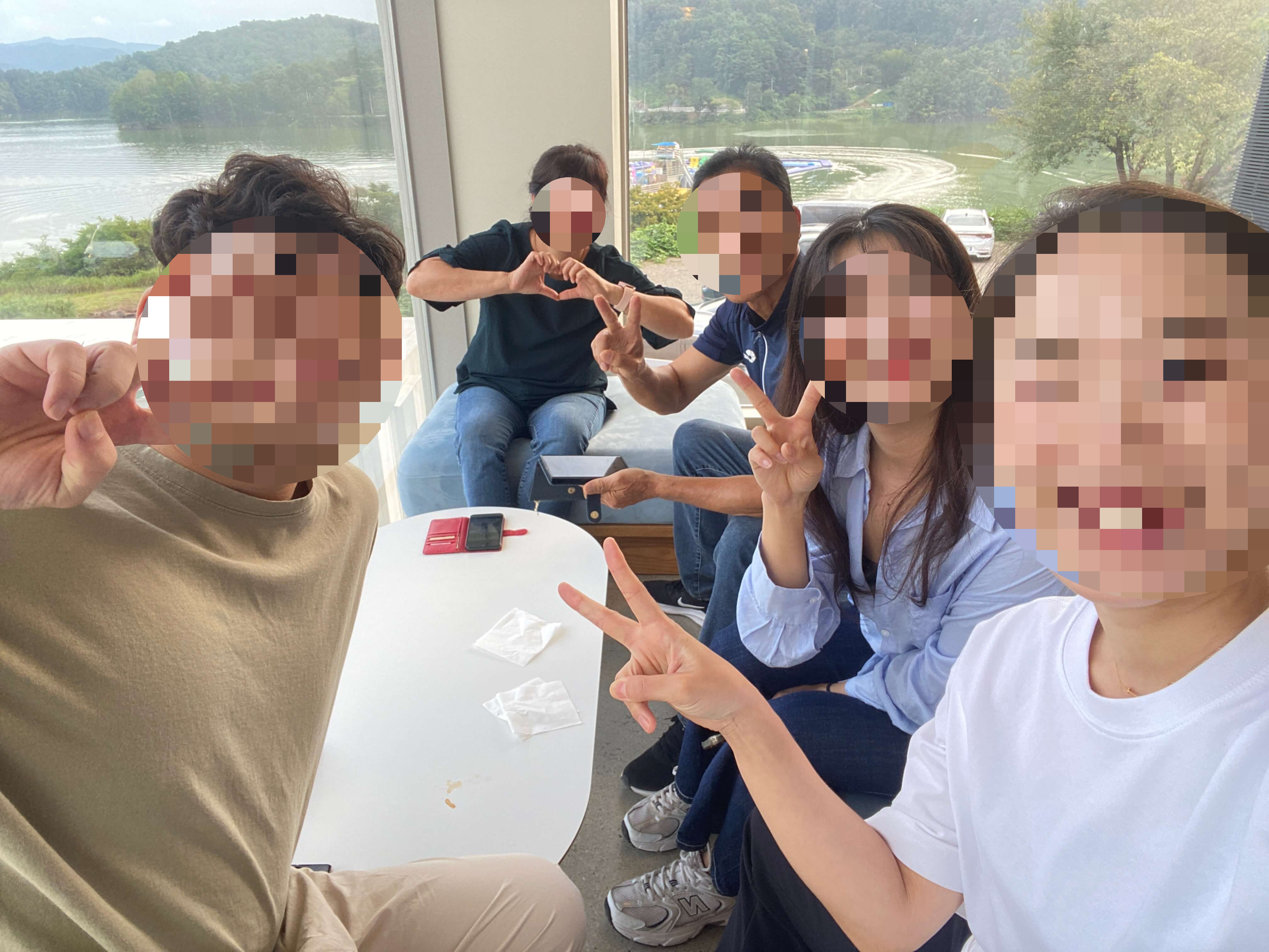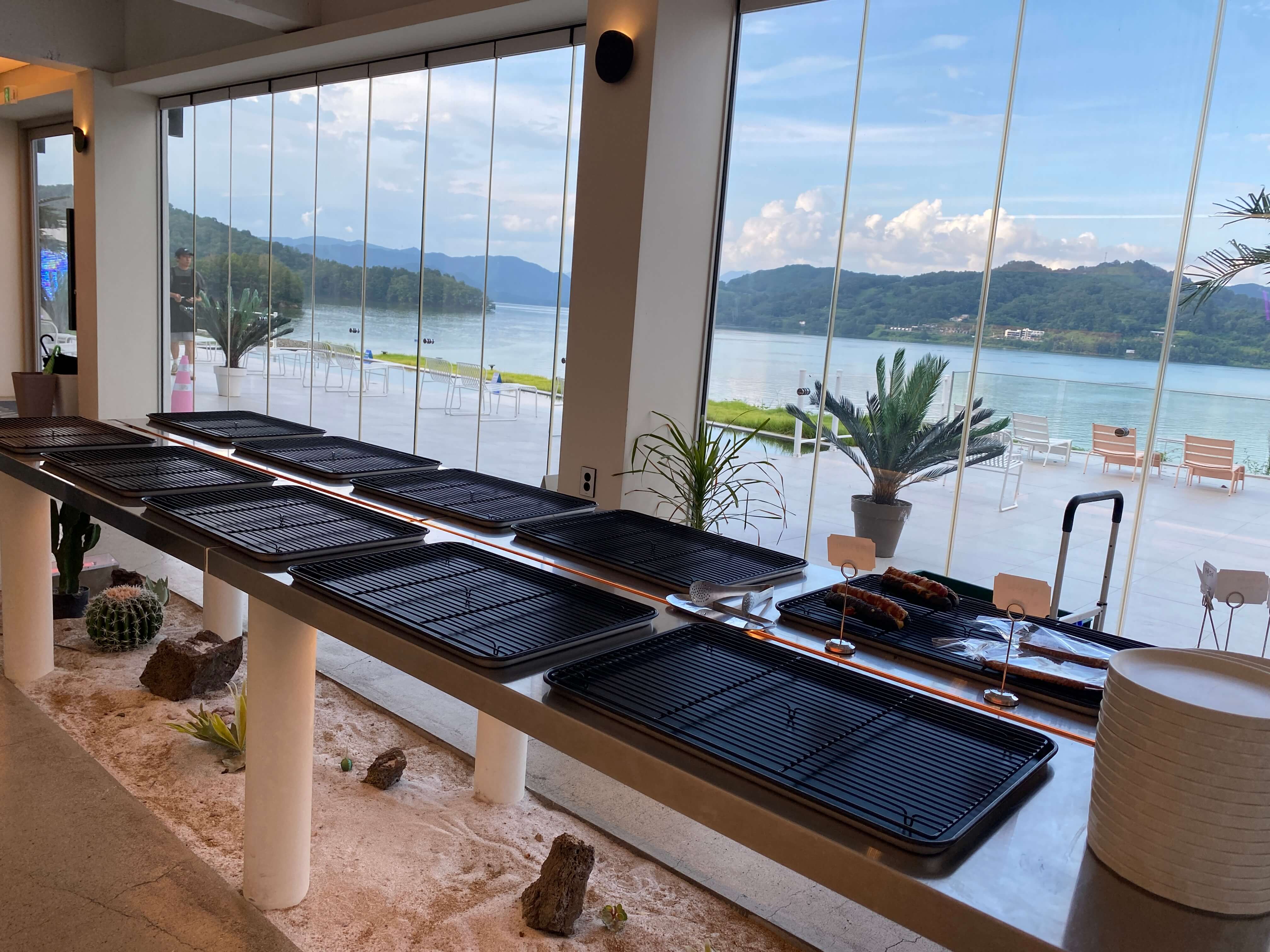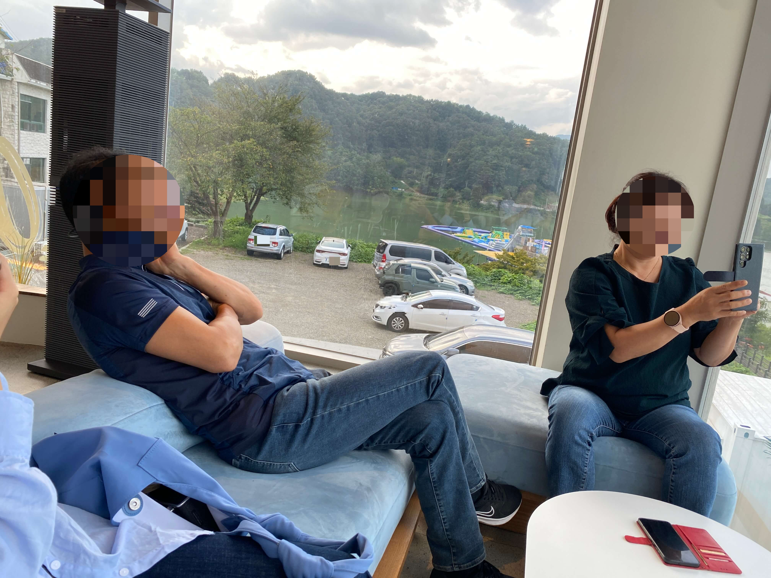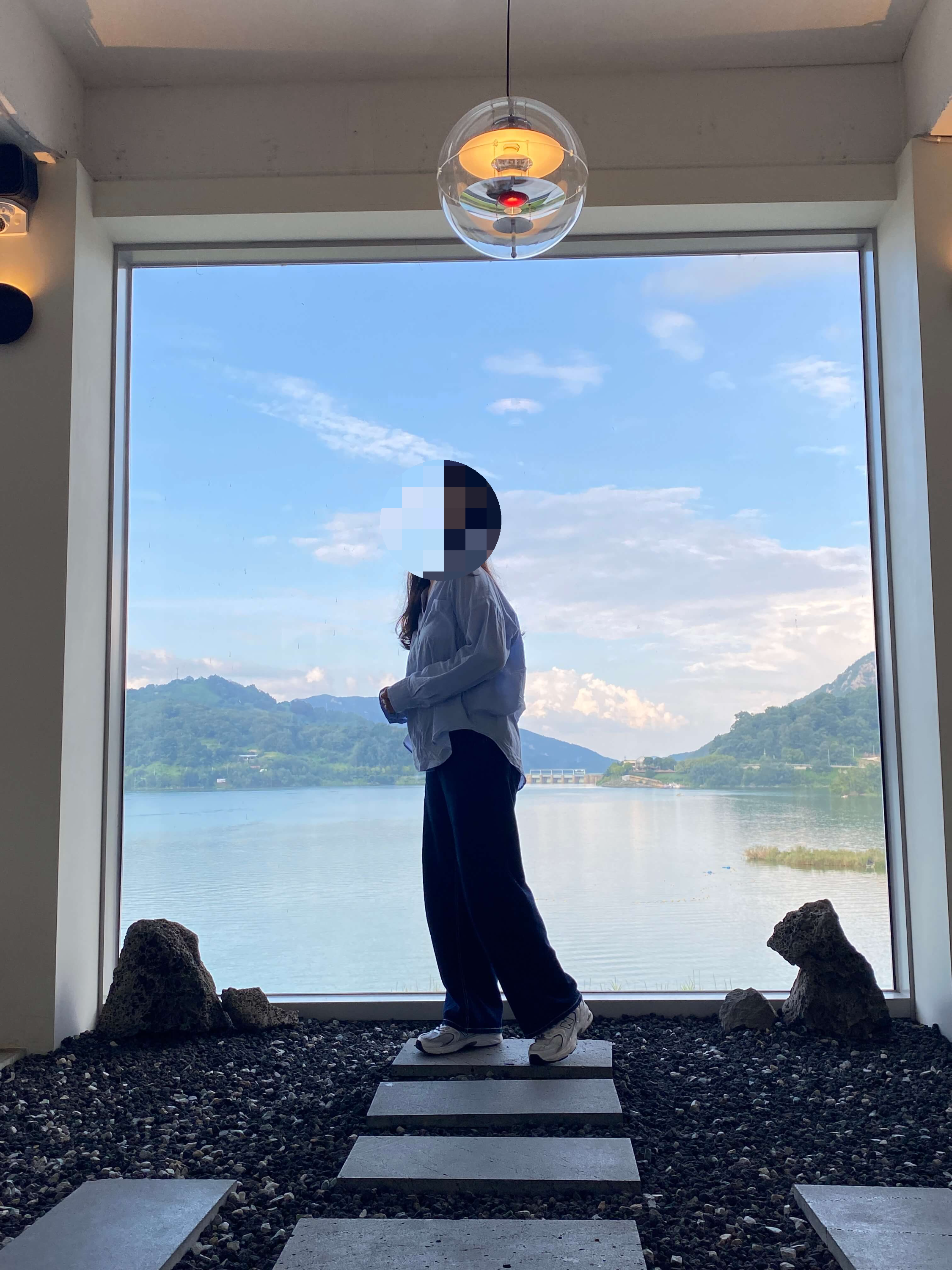 유리창 넘어로 보이는 합천호가 정말 그림같았어요. 사진 안 찍고 넘어가기에는 너무 아쉽죠?!