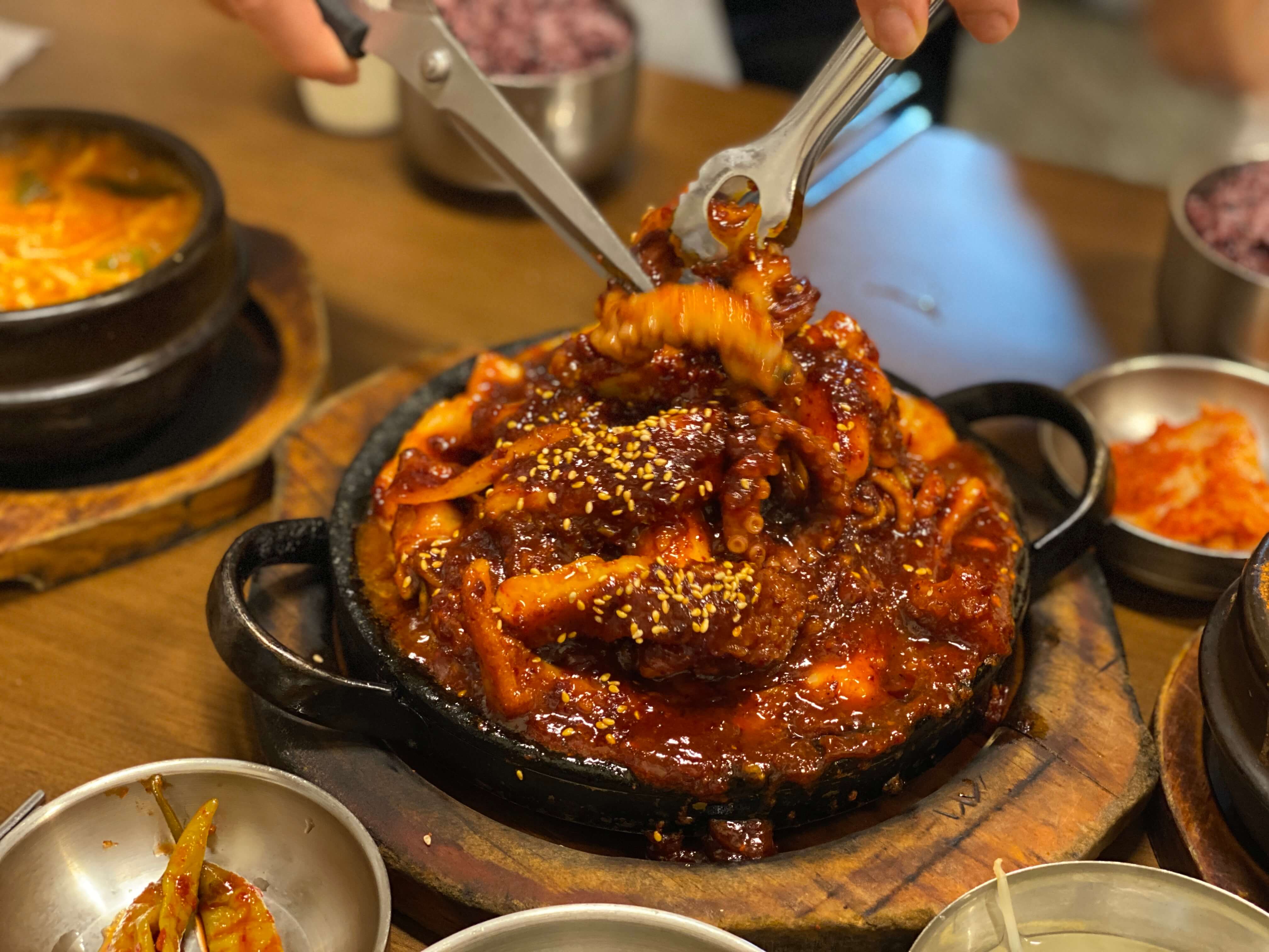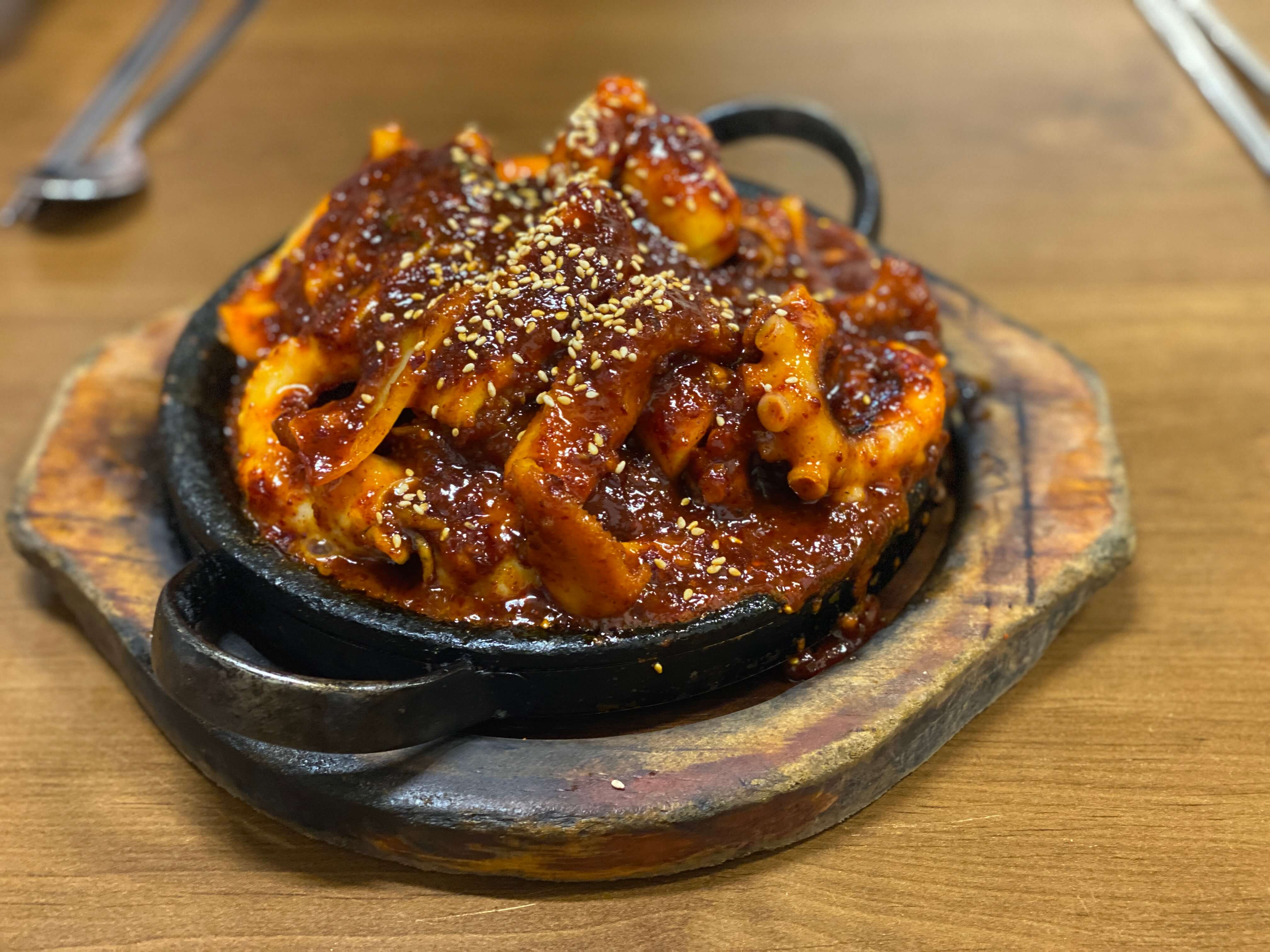 빨갛고 진한 양념 색깔이 아주 군침을 돌게 만들더라고요. 뜨거운 돌판 위에 나오는 돌판낙지볶음은 지글지글거리면서 나올만큼 상당히 뜨거운 상태로 나와요. 무턱대고 잡았다간 큰일 날 거 같아요.